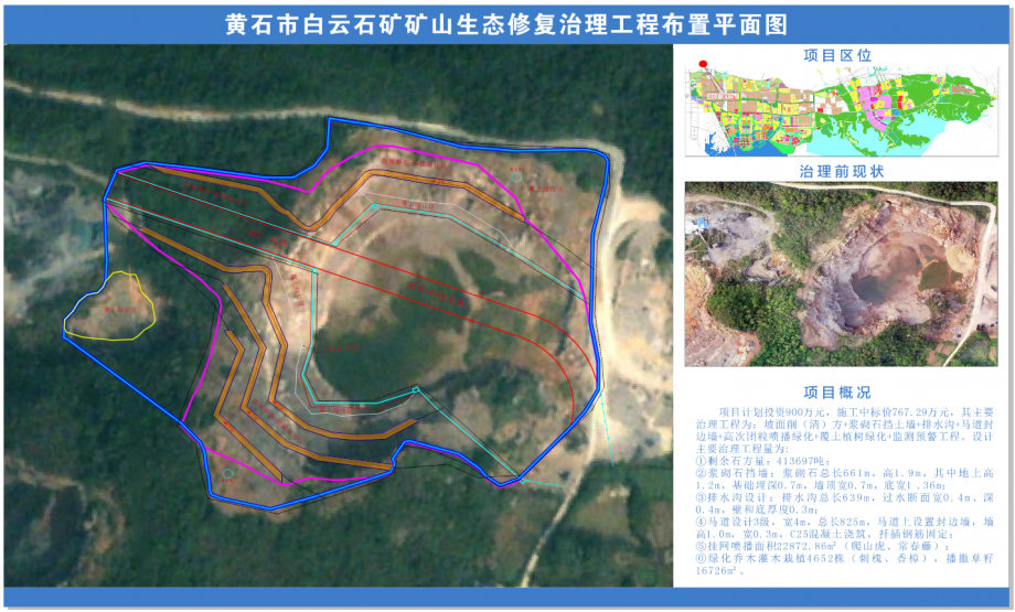 白云石礦礦山生態(tài)修復(fù)治理項(xiàng)目計(jì)劃投資900萬(wàn)元,工程造價(jià)767.29萬(wàn)元,工期:90日歷天,其主要工程為:坡面削(清)方+漿砌石擋土墻+排水溝+馬道封邊墻+高次團(tuán)粒噴播綠化+覆土植樹綠化+監(jiān)測(cè)預(yù)警工程。其中漿砌石擋墻總長(zhǎng)661m,設(shè)計(jì)排水溝總長(zhǎng)639m,設(shè)計(jì)3級(jí)馬道,總長(zhǎng)825m,掛網(wǎng)噴播面積22872.86m2(爬山虎常春藤),綠化喬木灌木栽植4652株(刺槐、香樟),播撒草籽16726m2。