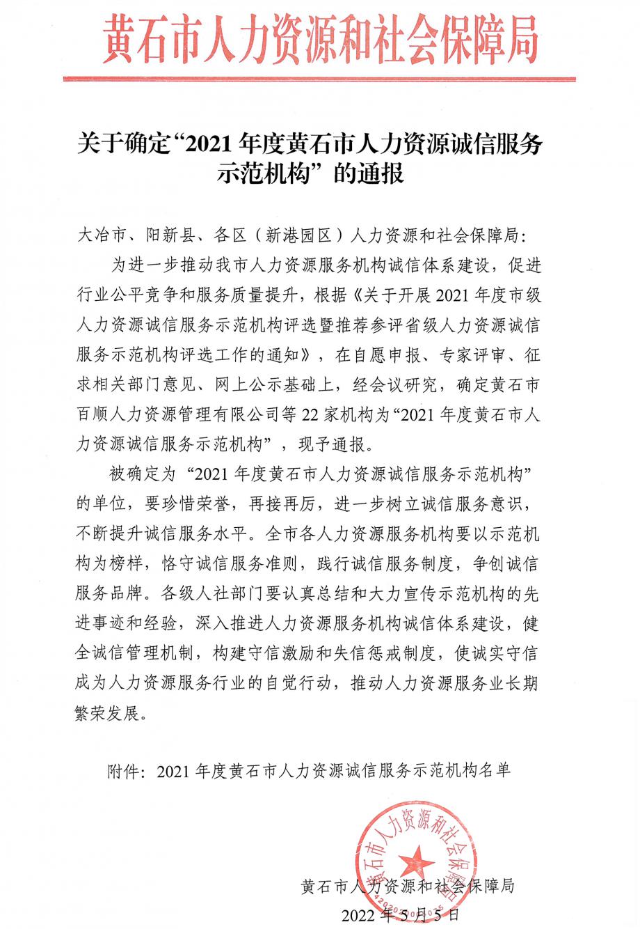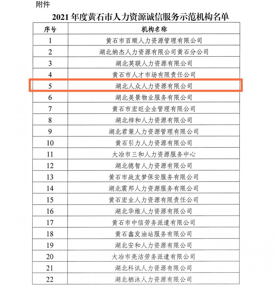 2021年度黃石市人力資源誠(chéng)信服務(wù)示范機(jī)構(gòu)名單