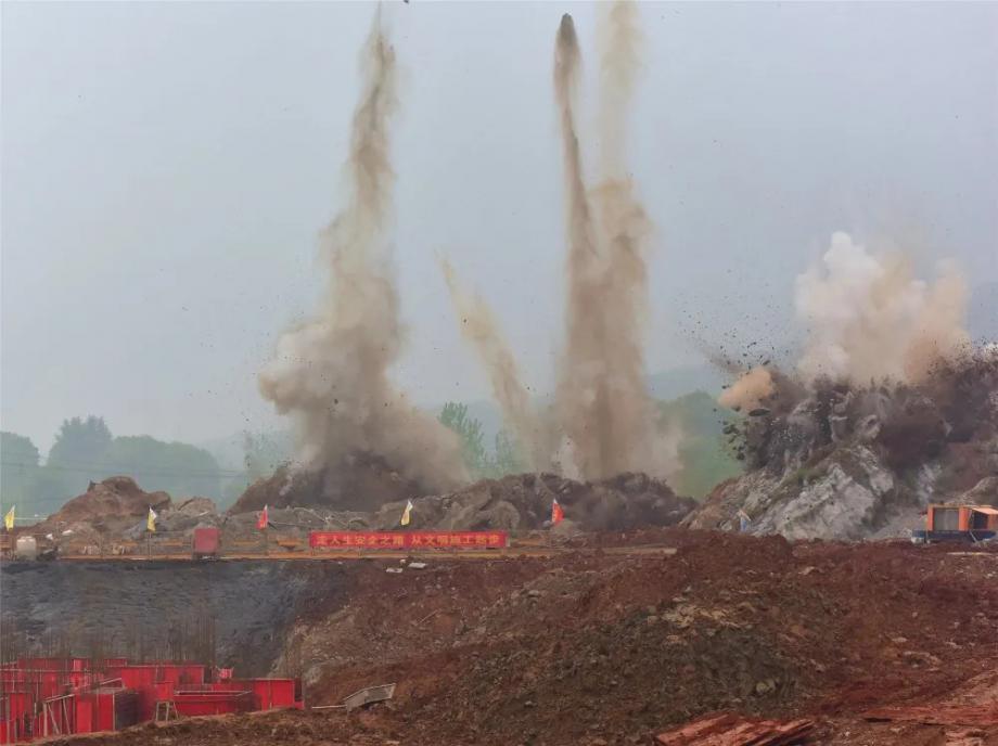 據(jù)勘察,現(xiàn)場地質(zhì)條件復(fù)雜罕見,需爆破石方總量約10萬立方米。為此,該公司積極組織各參建單位和有關(guān)專家,通過多輪現(xiàn)場踏勘和集中研討,最終確定采用機械鉆孔填充炸藥的方式,分15次實施爆破,本次石方爆破量約8000立方米。