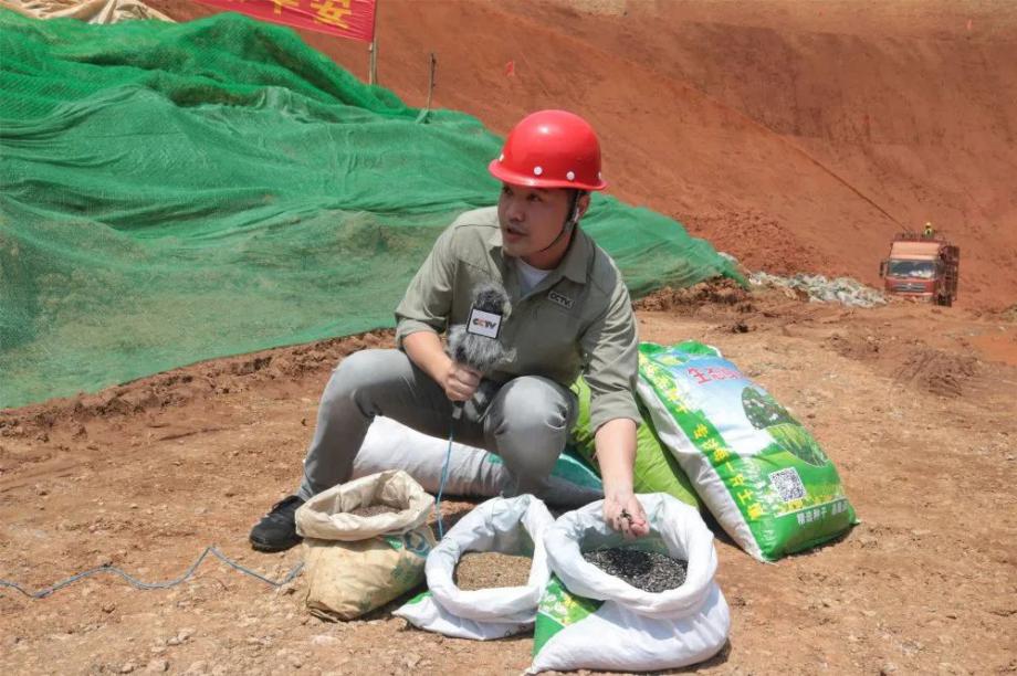 本次報(bào)道中,央視記者按照開山塘口修復(fù)的施工時(shí)間線,運(yùn)用了“灰、淡黃、棕褐、綠”這四種顏色,向觀眾形象、通俗地展現(xiàn)了開山塘口修復(fù)治理的全過程?;疑锹懵兜?、“受傷”的山,淡黃色是干草打碎后形成的草纖維,棕褐色是混入不同種子后的泥漿,綠色則是希望、是健康、是礦山修復(fù)的終極目標(biāo)。